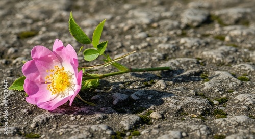 Fototapeta premium A small pink flower growing through cracked asphalt
