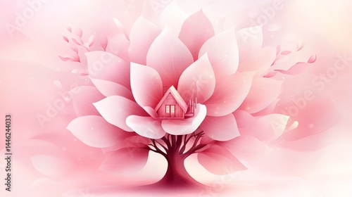 Naklejka premium A small pink house sits within a large flower blossoming from a tree with light pink petals.