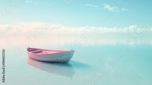 Naklejka premium A small pink rowboat floats in the middle of a calm, still body of water. The water is a soft, pastel blue with a hint of purple in the distance. The sky is a pale blue with fluffy white clouds.