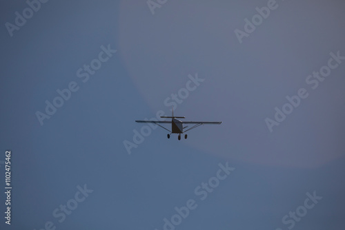 © casavella, Fototapeta premium A small plane flies over the Fervenza reservoir in Dumbria with a blue sky