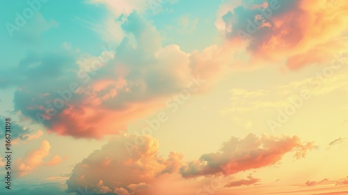 Fototapeta premium A small plane soars through the clouds above a sunny beach, with palm trees...