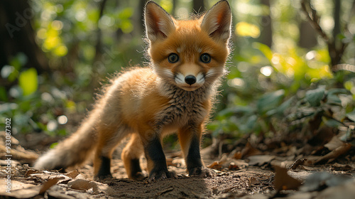 © Ambarwati, Fototapeta premium A small playful fox cub exploring a forest clearing