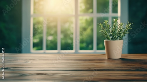 © Newvie, Fototapeta premium A small potted plant on a wooden table near a sunlit window, creating a fresh and calming atmosphere.