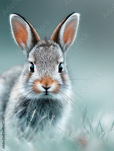 Fototapeta premium A Small Rabbit Eating Fresh Grass in the Bright Morning