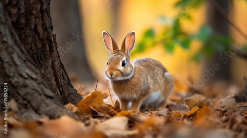 Fototapeta premium A small rabbit is standing in the leaves near a tree. Generative AI