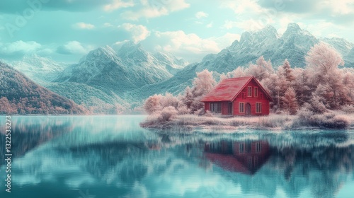 © Anak, Fototapeta premium A small red cabin rests near a serene lake and tall mountains