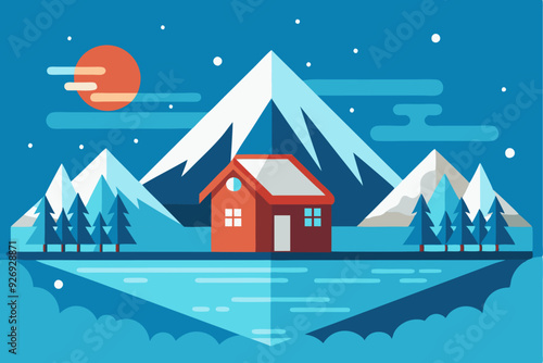 © Design Crea, Naklejka premium A Small Red Cabin Situated in a Mountainous Landscape with a Body of Water in Front