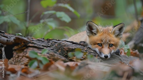 © LOMOSONIC, Naklejka premium A small red fox is laying on a log in the woods