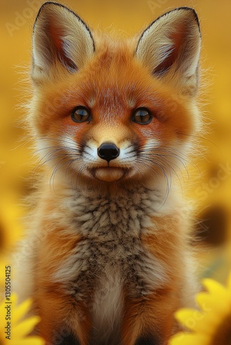 © Wall, Obraz premium A small red fox sitting in a field of yellow flowers