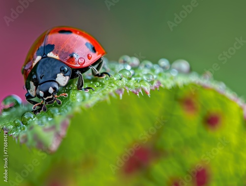 Fototapeta premium A small red ladybug with black spots perched on a green leaf