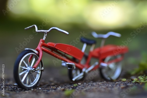 © Fotograf, Obraz premium A small red toy bike sits on the ground, possibly waiting for its next adventure