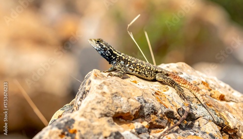 Obraz premium A small reptile, with patterned scales, rests atop a rough, textured stone, blending well with the natural surroundings. The blurred background hints at greenery