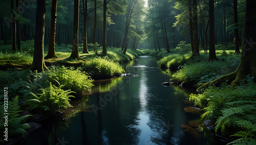 © Kaila, Fototapeta premium A small river meanders through the forest. Forest view