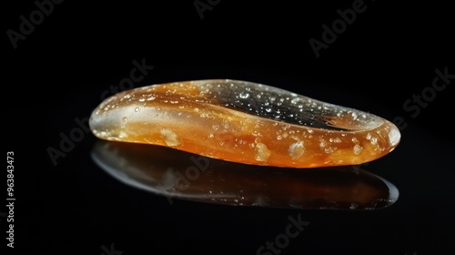 © Charoen, Obraz premium A small, round, orange object with a dark background. The object is shiny and has a reflective surface