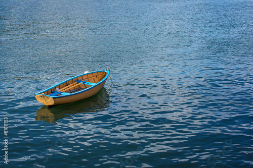 © cookiesfordevo, Naklejka premium A small row boat sitting calmly in a harbor