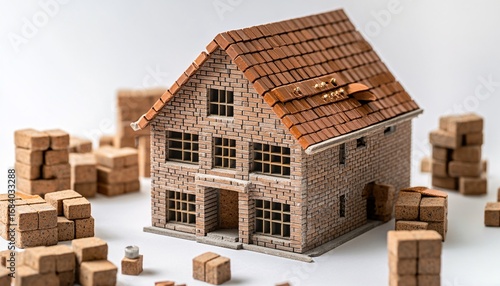 © Studicon, Fototapeta premium A small-scale model of a brick house is shown with additional bricks in stacks and piles nearby on a white background.