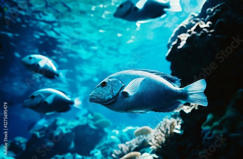 © schmidt, Fototapeta premium A small school of blue fish swims above white coral