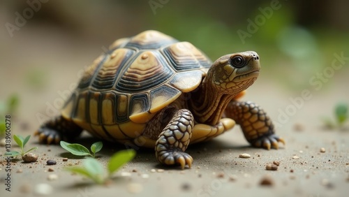© Nova, Obraz premium A small shelled reptile slowly making its way across the ground, amidst tiny green plants and scattered particles