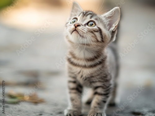 Naklejka premium A small silver kitten stands on the ground, looking up with bright eyes, displaying a curious expression in a serene outdoor environment