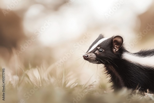 © Elmira, Fototapeta premium A small skunk stands alert in a grassy field, surveying its surroundings while the natural landscape creates a soft, blurred backdrop