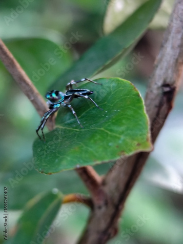 © Wendi, Fototapeta premium A small spider with a shiny black body with a greenish blue pattern was standing on a green leaf.