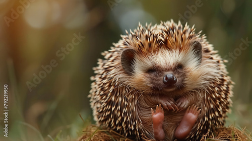 Fototapeta premium A small, spiny hedgehog wildlife with brown fur snuffles around in a grassy area,