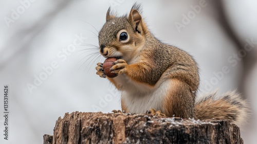 Obraz premium A small squirrel with an acorn in its paws, sitting on a tree stump, on a...