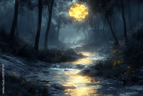 Naklejka premium A small stream flowing through a forest its water glow