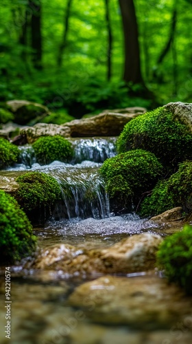 © VISUAL BACKGROUND, Fototapeta premium A small stream running through a lush green forest