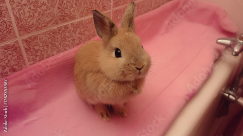 © AndyGordon, Obraz premium A small tan rabbit sitting on a pink blanket inside a bathtub, looking up adorably.