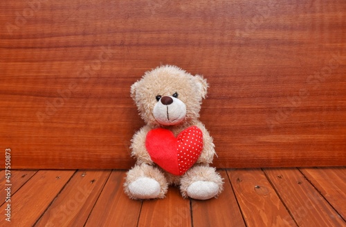 Obraz premium A small teddy bear with red heart. Valentine's day