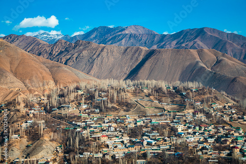 © oybekostanov, Obraz premium a small town view from the top of the mountain with a lot of residence and less vegetation