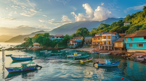 © PhotoStudioWizard, Naklejka premium A small town with a lot of boats in the water