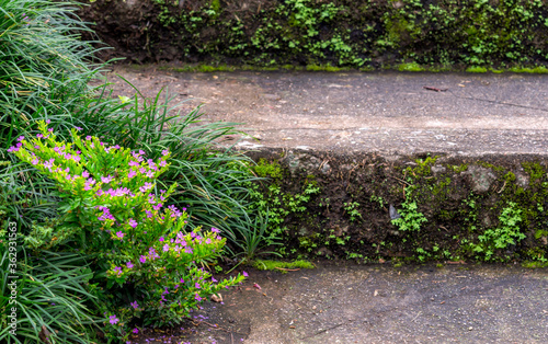 Fototapeta premium A small tree grows and blooms on the stairs.(naturally have to adapt to...
