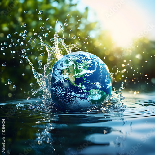 Fototapeta premium A small tree grows on a globe floating in water, symbolizing environmental...
