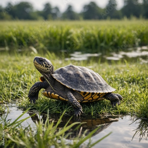 Fototapeta premium A small turtle basking in a grassy field near a pond, with a radiant white...