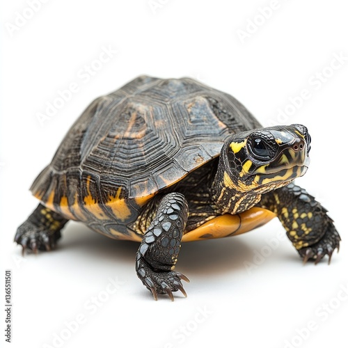 © aku, Fototapeta premium A small turtle, dark brown and yellow patterned shell, in profile view, isolated on white background.
