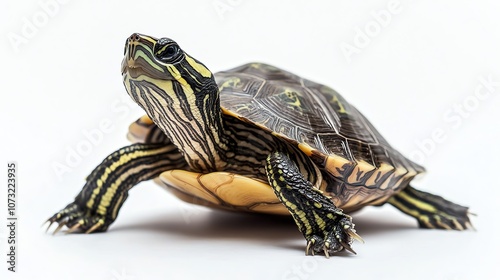 © Galib, Obraz premium A small turtle with a patterned shell crawls forward on a white background.
