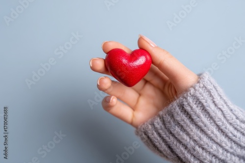 Fototapeta premium A small, vibrant red heart is held gently in a hand wearing a warm gray...