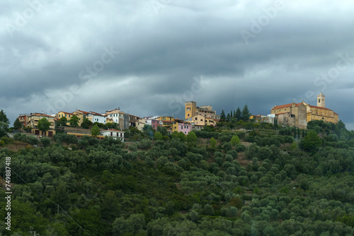 Obraz premium A small village perched on the peak of a hill, surrounded by fields and forests