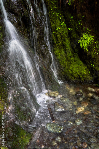 Naklejka premium A small waterall cascades down a dark cliff into a stream bed with colorful rocks amongst lush moss.