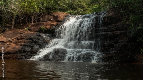 © sobartea, Fototapeta premium A small waterfall cascades down rocky steps into a clear pool.