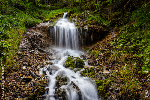 Naklejka premium A small waterfall in the beautiful Lauterbrunnen valley which is a UNESCO...