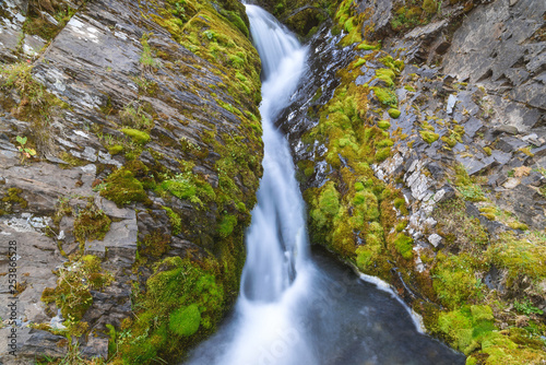 © Elza_R, Obraz premium A small waterfall in the mountains between two moss-covered cliffs
