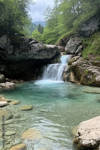Naklejka premium A small waterfall trickling into a clear river surrounded by boulders