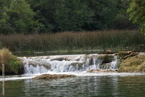 Obraz premium A small waterfall, with rocks in the river, and grass and forest in the...