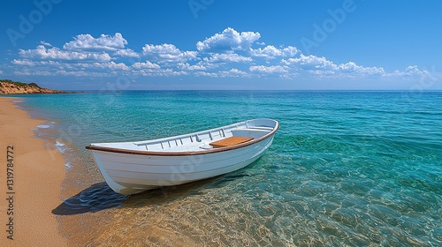 © Wall, Naklejka premium A small white boat sitting on top of a sandy beach