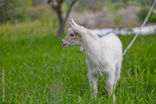 © Maryna, Obraz premium A small white goat on a green lawn.