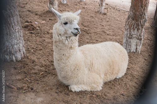 Obraz premium A small white lama relaxes lying on the ground