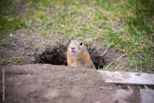 Naklejka premium a small wild ground squirrel looks out of a hole next to the road, waiting to...